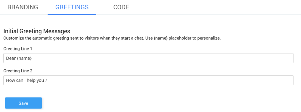 In the Greetings tab, customize the automatic greeting sent to visitors when they start a chat. Use {name} placeholder to personalize.