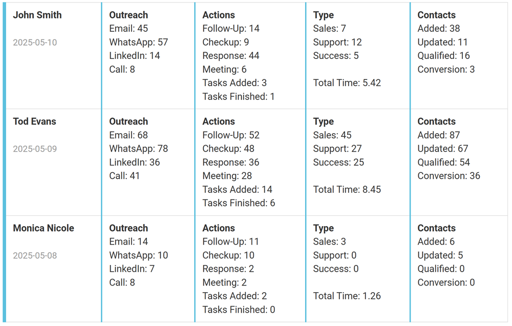 The CRM section functions as a personalized activity log, providing users with a clear daily summary of their interactions and performance. Each record is organized by date and attributed to the logged-in user, offering a quick snapshot of key metrics that reflect outreach efforts, task management, and contact handling.