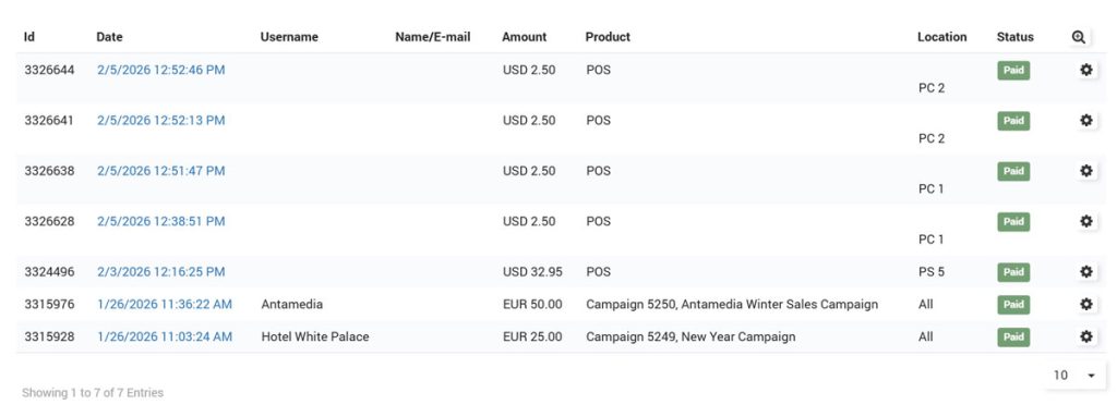 Review payment activity and transaction history, including status and basic purchase details for troubleshooting and reporting.