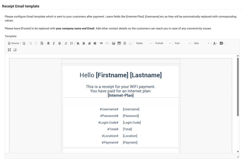 Customize the receipt format and details shown after payment, so invoices and printouts match your business requirements.