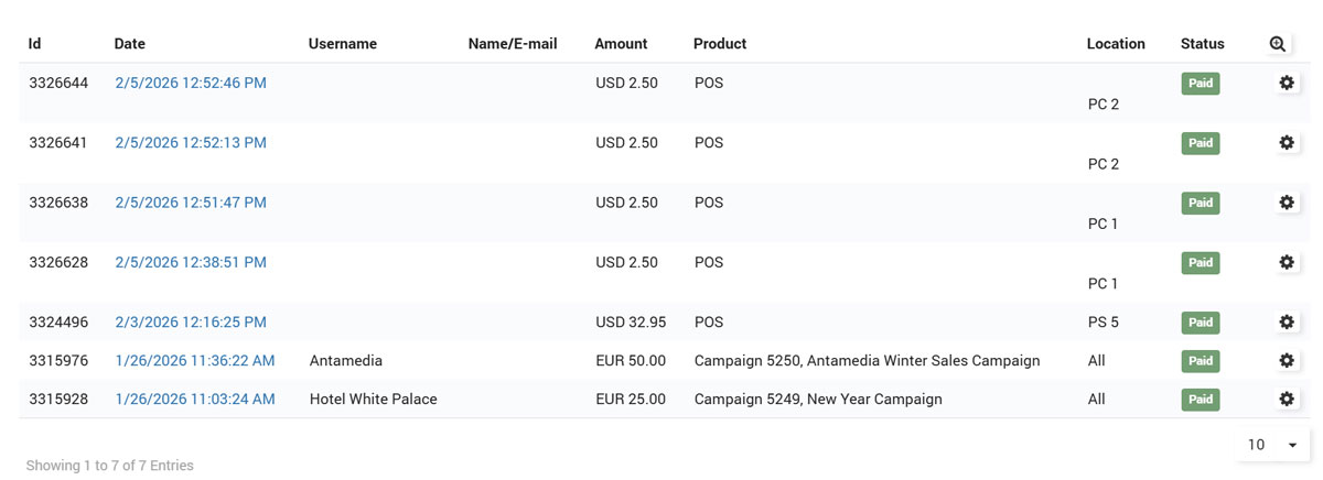 Review payment activity and transaction history, including status and basic purchase details for troubleshooting and reporting.