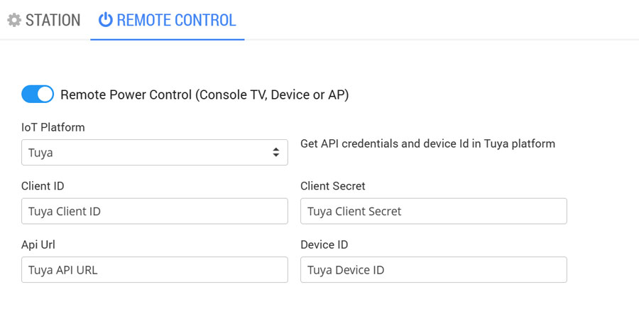 Cloud Station uses the Tuya IoT platform to manage power, which requires you to enter your Tuya API credentials (Client ID, Secret, Device ID, and API URL). Once connected, you can turn devices on or off remotely from the Cloud Station portal.