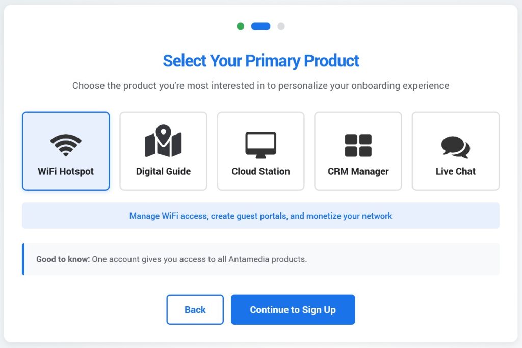 Pick the primary product you want to start with: WiFi Hotspot, Digital Guide, Cloud Station, CRM Manager, or Live Chat.