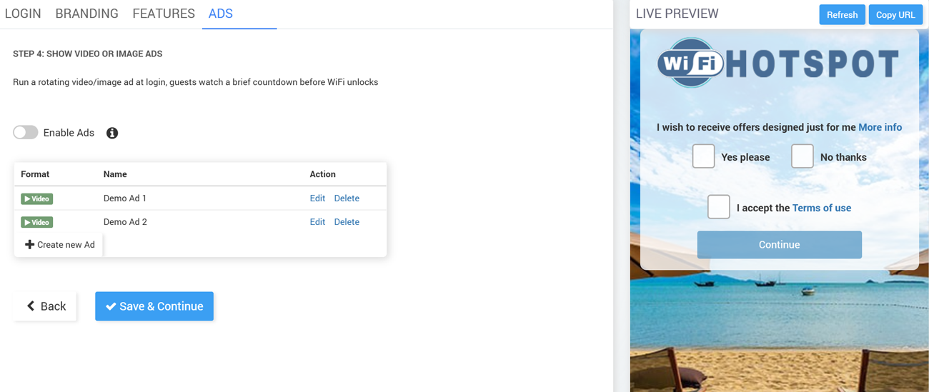 Add, edit, or delete video/image ads that play before WiFi access is granted.