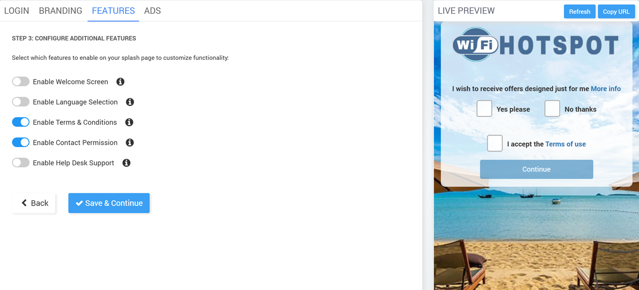 The onboarding process for setting up a splash page in Antamedia Cloud WiFi is divided into four steps, accessible via tabs: Login, Branding, Features, and Ads. A live preview panel on the right shows real-time updates of the splash page.